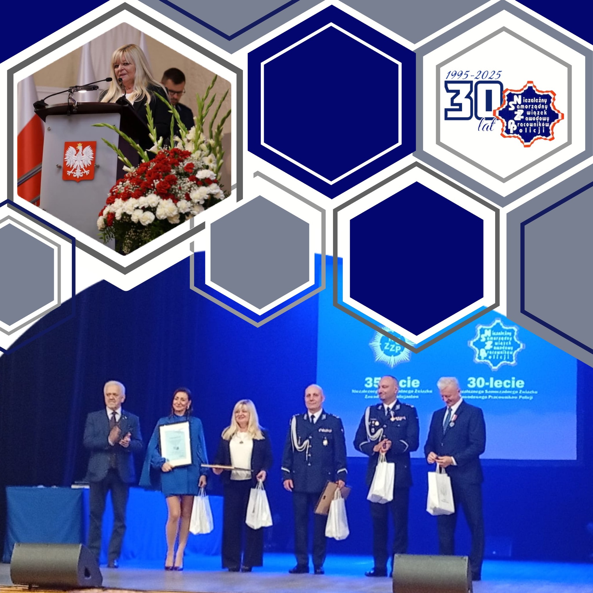 W swoim wystąpieniu kol. Szymaniak nadmieniła, że jubileusz jest znamienitym czasem do podsumowań, wspomnień i wdzięczności… „Trzydzieści lat temu grupa ludzi pełnych odwagi i społecznej wrażliwości postanowiła zjednoczyć swoje siły, by bronić praw, interesów i godności pracowników Policji. Dzięki ich determinacji powstał Związek, który stał się silnym głosem środowiska pracowników Policji — ludzi. Z tego miejsca specjalne słowa uznania dla kolegów Michała Ćwieki, Władysława Grzegorka, Zbigniewa Szmigiero, Bogusława Gołuńskiego oraz Mariusza Jarockiego, którzy w sposób szczególny są zasłużeni naszej związkowej społeczności tworząc jej struktury na szczeblu krajowym i wojewódzkim. Od tamtego czasu NSZZ Pracowników Policji niezmiennie stoi na straży wartości, które są fundamentem służby publicznej: solidarności, uczciwości, wzajemnego szacunku i współpracy. Trzydzieści lat działalności Związku to historia ludzi – ich odwagi, zaangażowania i wiary w sens wspólnego działania. To historia tysięcy rozmów, pism, negocjacji i decyzji, które nie zawsze były łatwe, ale zawsze podejmowane w jednym celu – by chronić godność i prawa pracowników Policji. Przez trzy dekady Związek z nieustającą determinacją reprezentował interesy swoich członków, inicjował dialog ze stroną rządową, dbał o warunki pracy i godność ludzi wykonujących niezwykle odpowiedzialne zadania”.